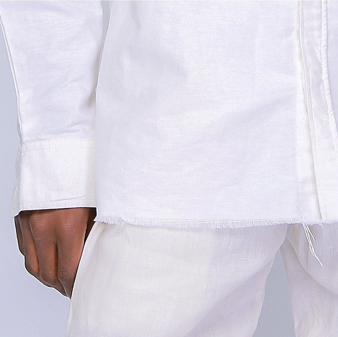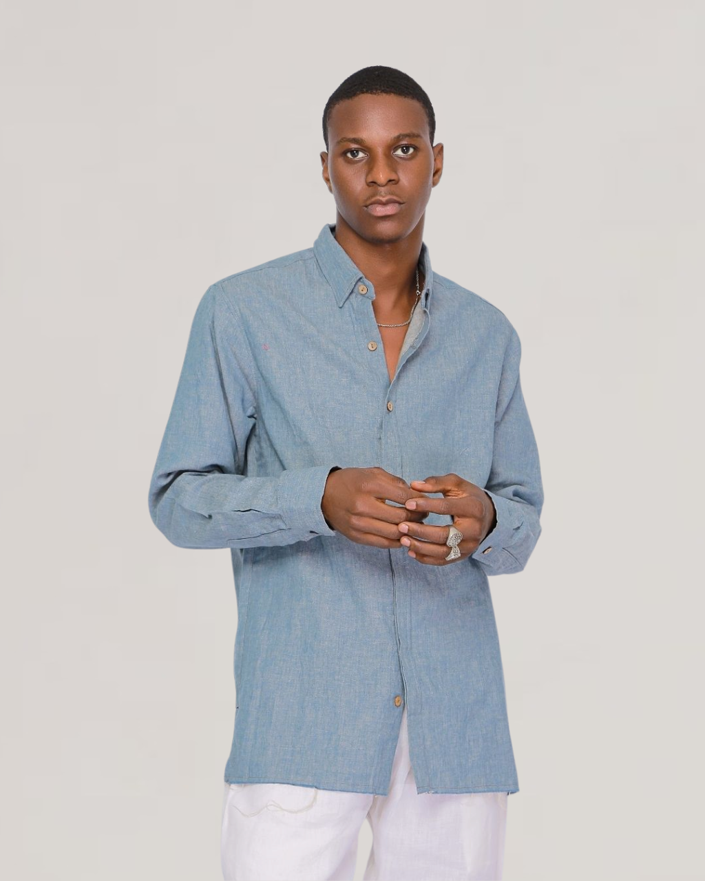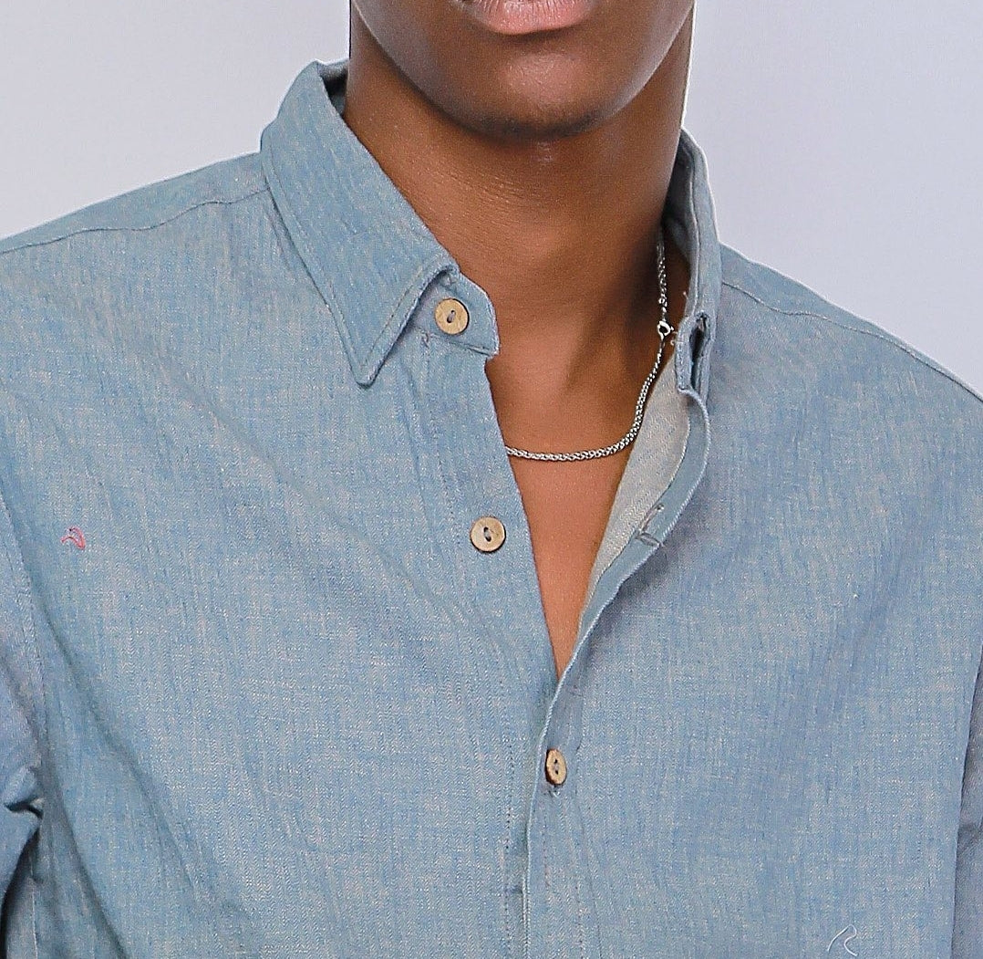 This is a classic piece is made with Japanese fabrics and sewn in Nigeria. The chambray fabric consists of 45% linen 55% cotton. We suggest you dry clean or hand wash for the best results